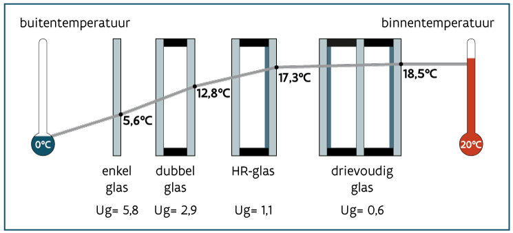 Hieronder wordt duidelijk weergegeven wat de impact is als u uw oude ruiten (enkelglas, dubbelglas) vervangt voor HR++ glas of triple glas.